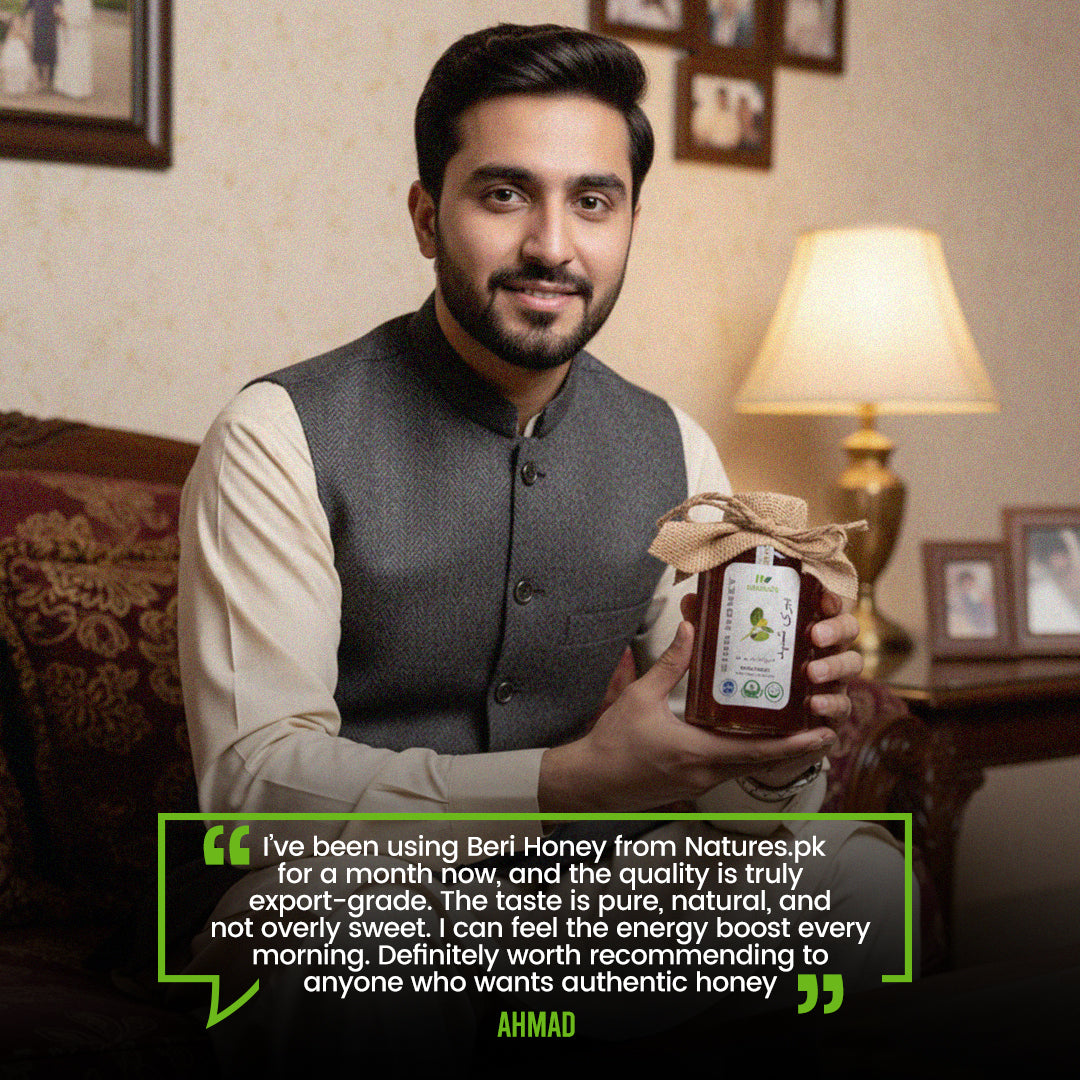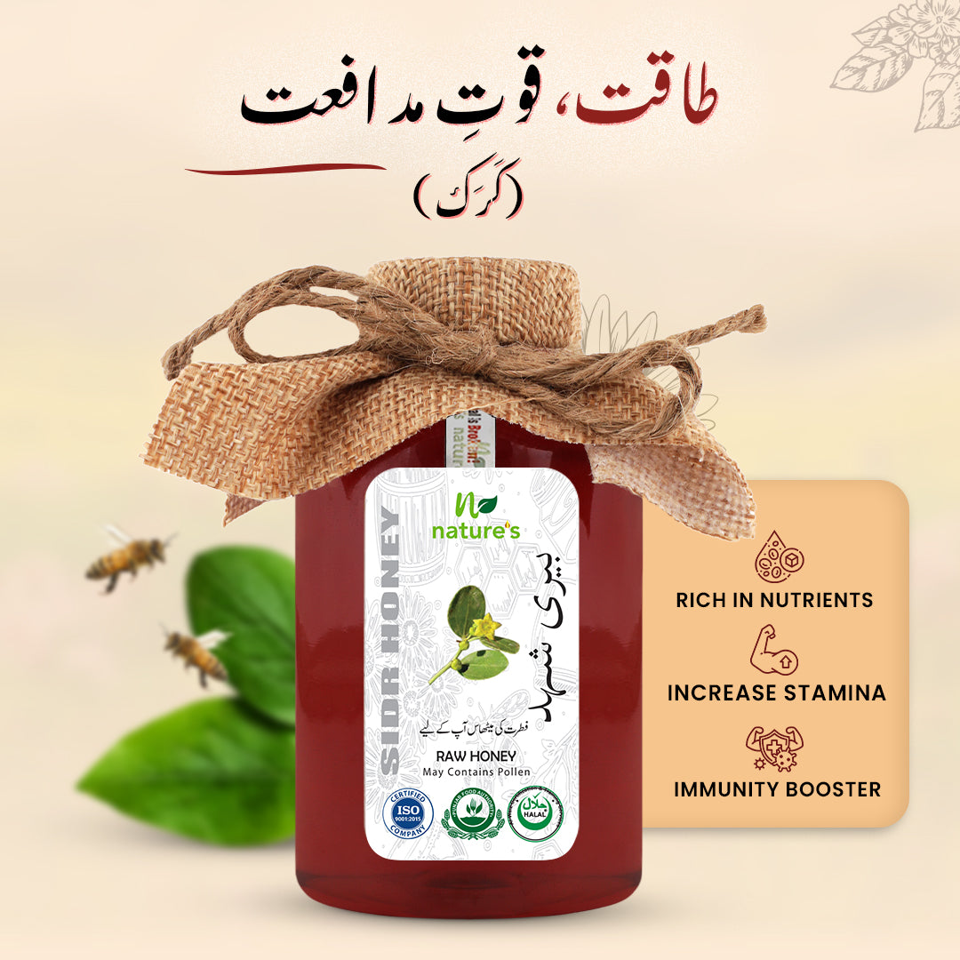 Pure Sidr (Berry) Honey — a rare masterpiece from the natural forests of Karak, where choti makhiyan (small bees) gather nectar from the sacred Sidr (Berry) trees. This honey is celebrated for its deep golden color, rich aroma, and smooth texture — a symbol of purity and heritage. Known as one of nature’s finest gifts, it combines exceptional taste with remarkable healing power, offering true nourishment for the body, mind, and soul.